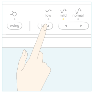 「start/stop」スイッチを押しながら、「timer」スイッチを3秒間長押しするとswingランプが点灯し、タイマーメロディが流れ、音量設定モードになります。